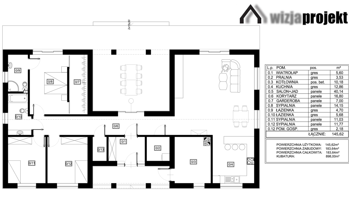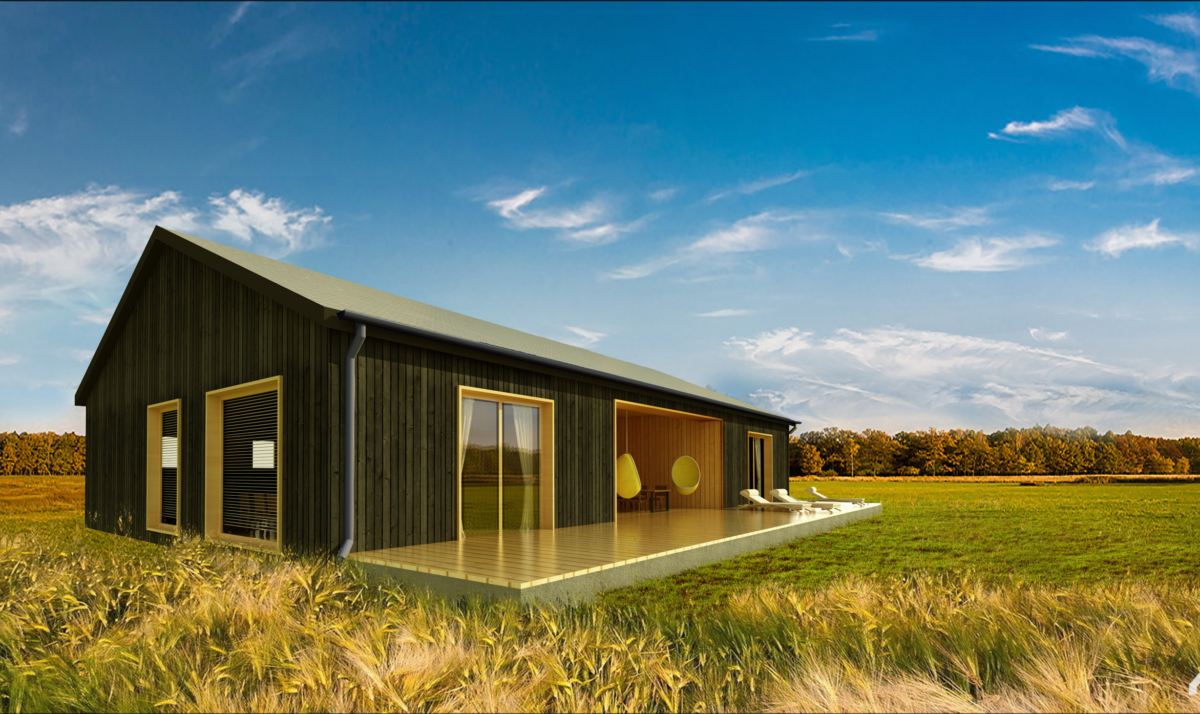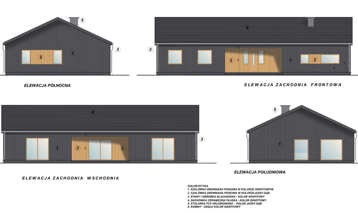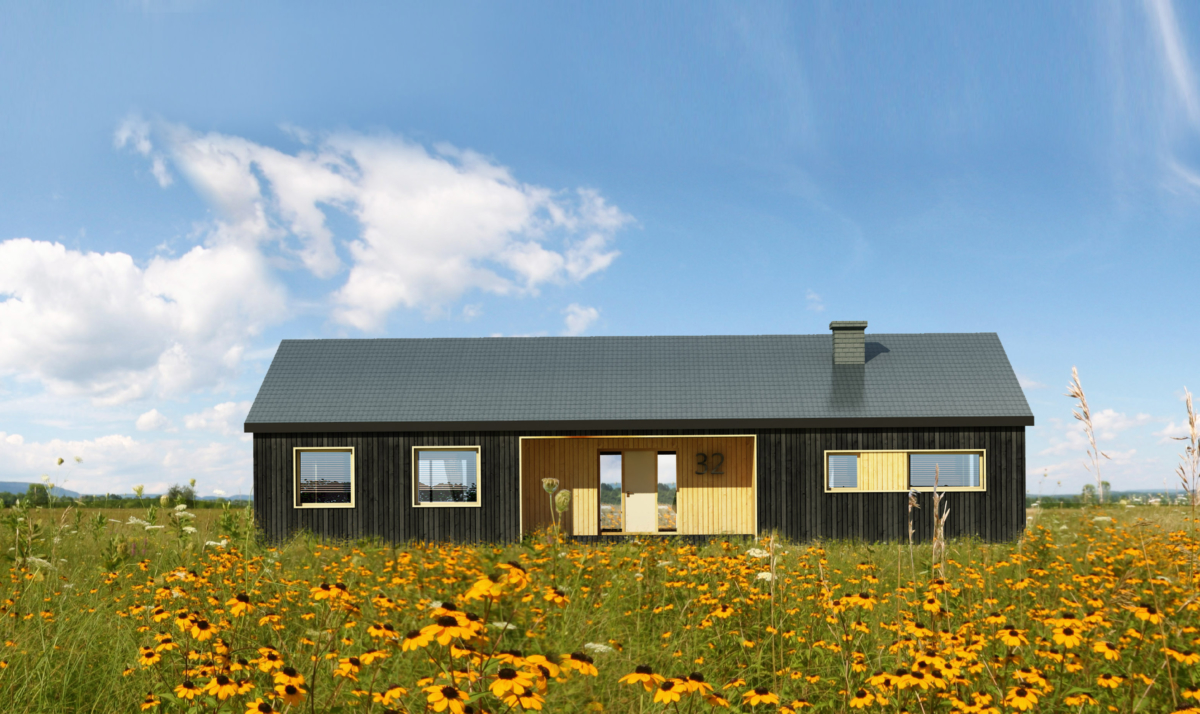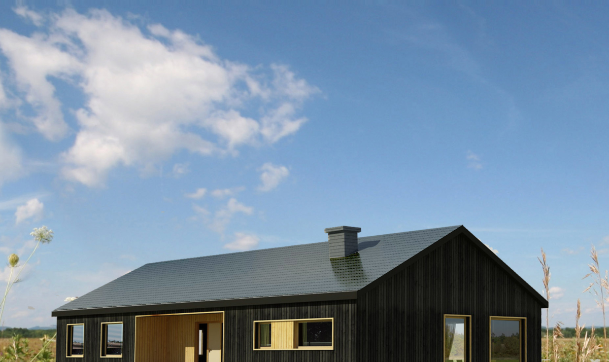 Projekt domu nowoczesnej stodoły. Budynek parterowy, murowany, elewacja drewniana. Projektant użył deski pionowej w szarej tonacji, przełamanej jasnym, ciepłym kolorem drewna. Budynek przykryty dachem dwuspadowym. Projekt zakłada zainstalowanie rekuperacji oraz paneli fotowoltaicznych. Projekt budynku zlokalizowno w uroczym położeniu wsi Lipiny.