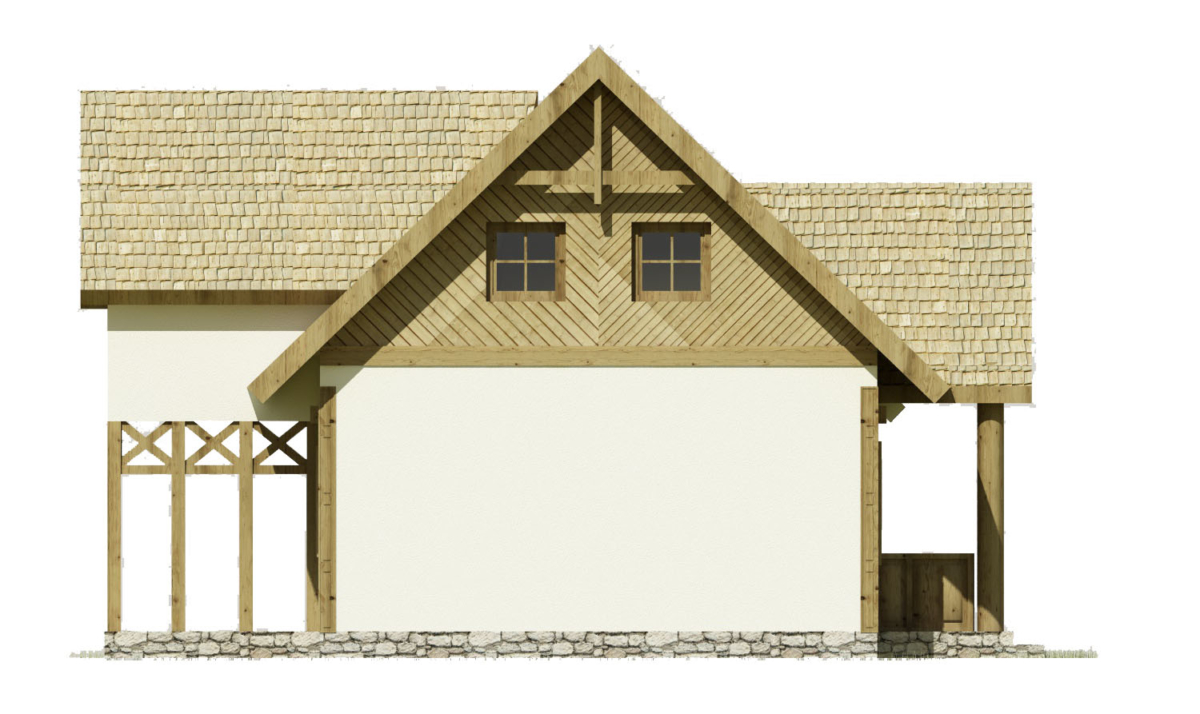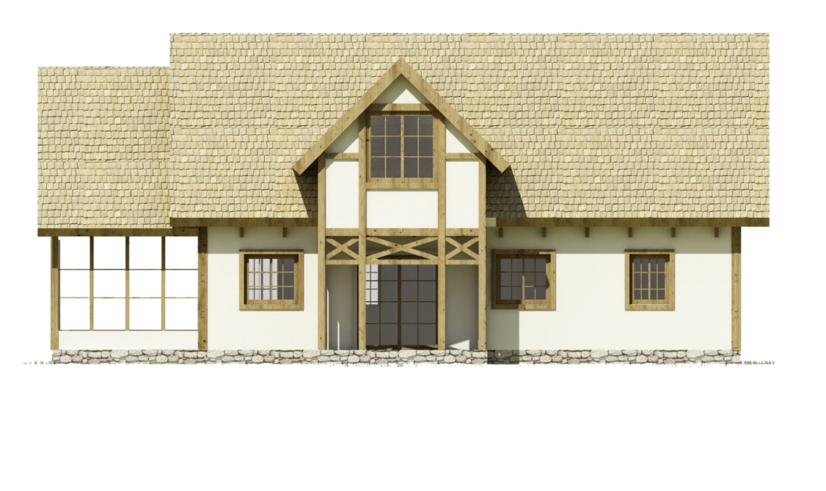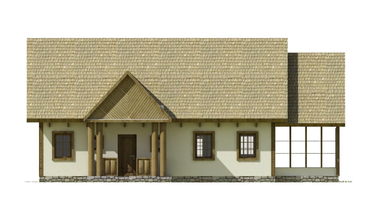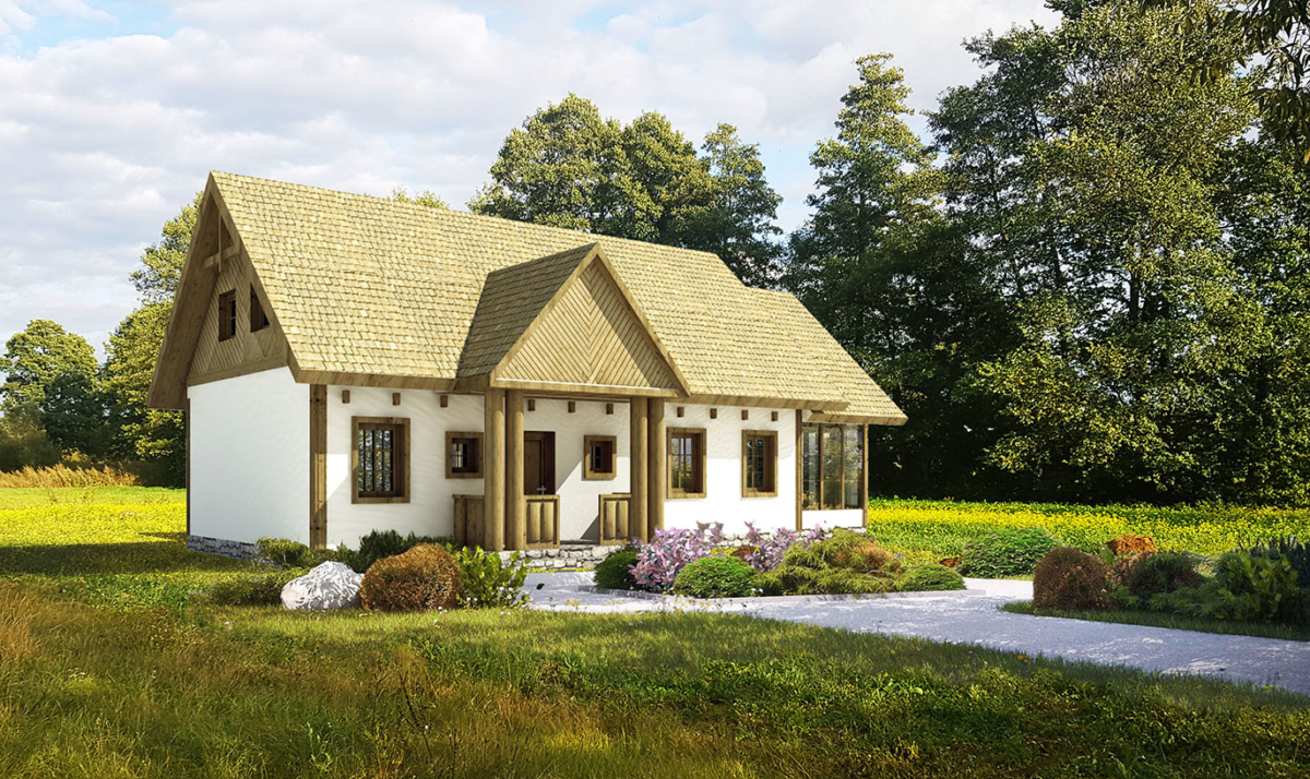 Projekt budynku w stylu wiejskiego dworku. Konstrukcja budynku została przeniesiona ze starego drewnianego budynku. Wpłynęło to znacząco na układ pomieszczeń i konieczność podparcia konstrukcji wewnątrz. Elewacje zewnętrzne w białym tynku z drewnianym detalem.