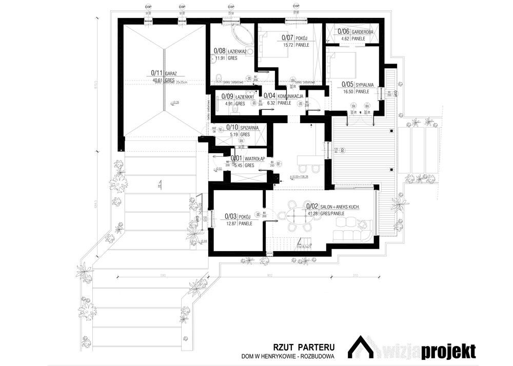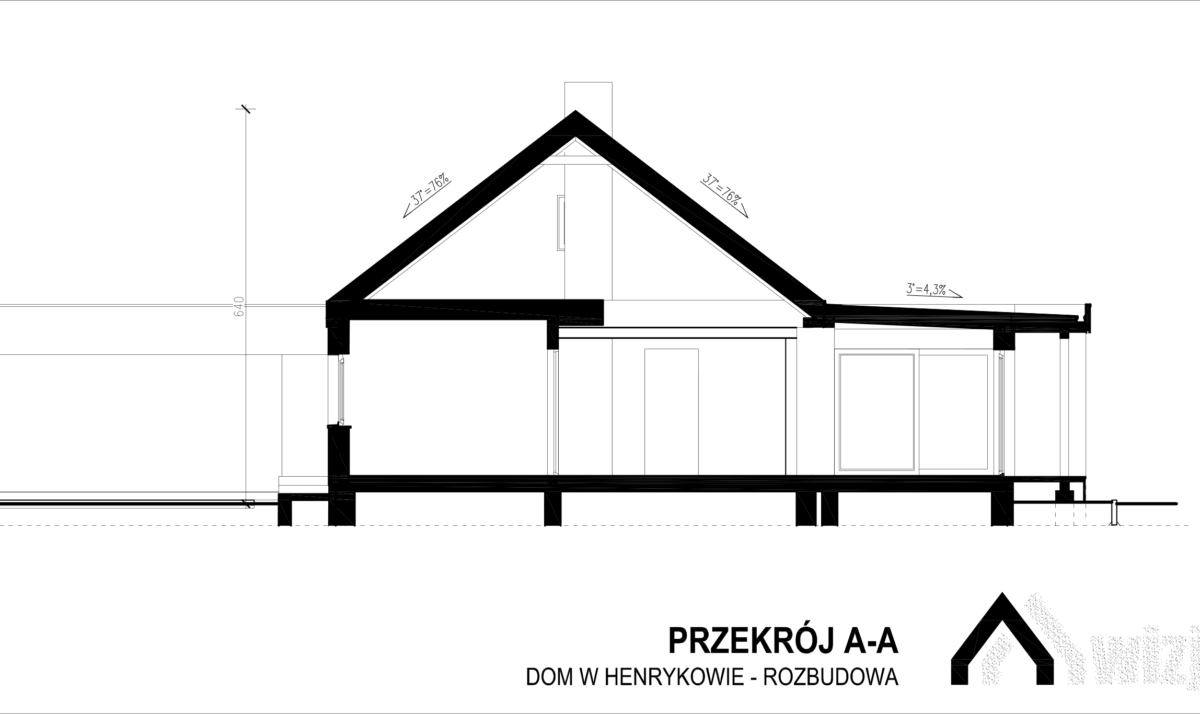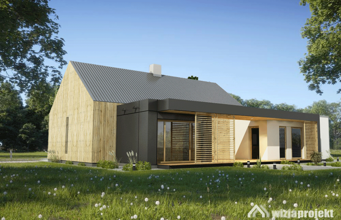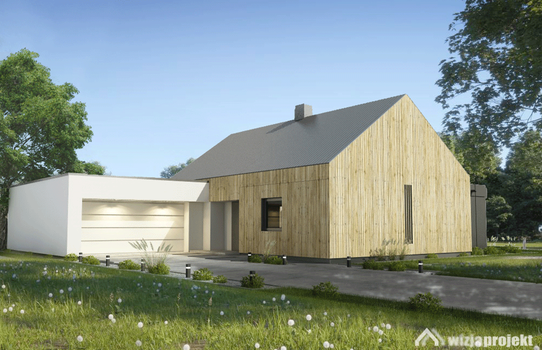 projekt rozbudowy domu jednorodzinnego w okolicach Białegostoku. Przed rozbudową był to nieduży (ok. 80m2) typowy budynek mieszkalny z dwuspadowym dachem. Nowoczesnego charakteru nabrał poprzez usunięcie okapów. Do budynku dobudowano dwie przenikające przez istniejący budynek prostopadłościenne bryły. Elewację istniejącej części pokryto szalówką pionową o różnej szerokości produkowaną przez inwestora.